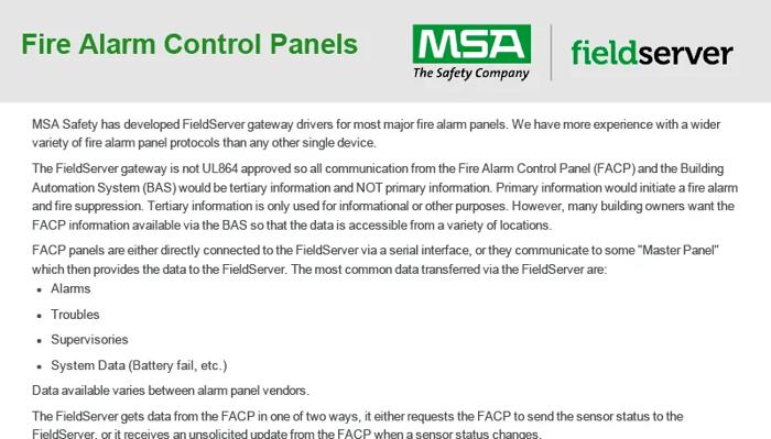 MSA Safety has developed FieldServer gateway drivers for most major fire alarm panels. We have more experience with a wider variety of fire alarm panel protocols than any other single device.
